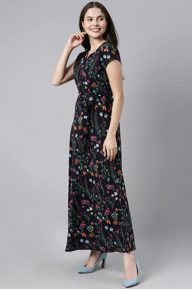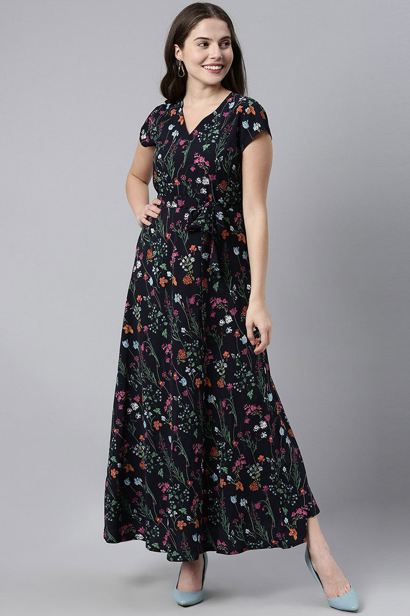 Ahika’s poly georgette navy blue floral maxi dress is a must-have dress for your summer wardrobe. This navy blue and pink floral maxi dress is made using a soft polyester fabric that hugs every body shape beautifully.