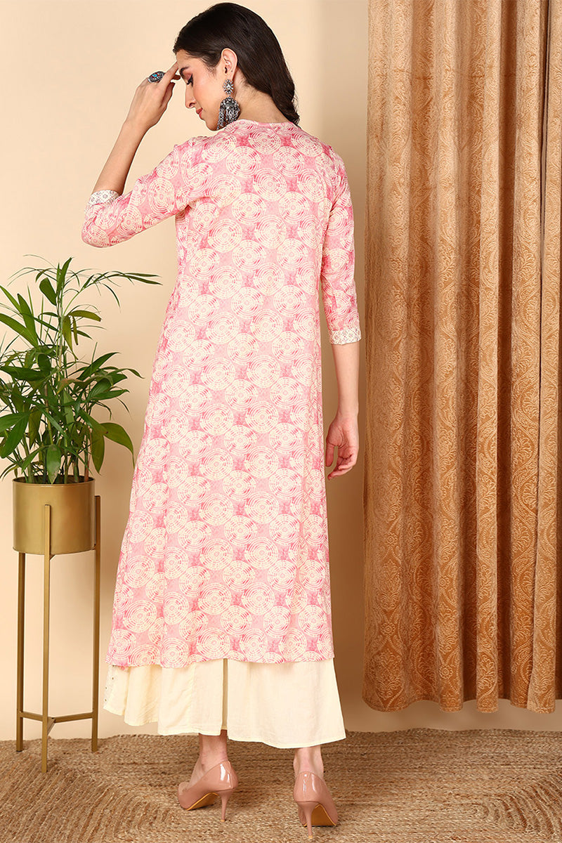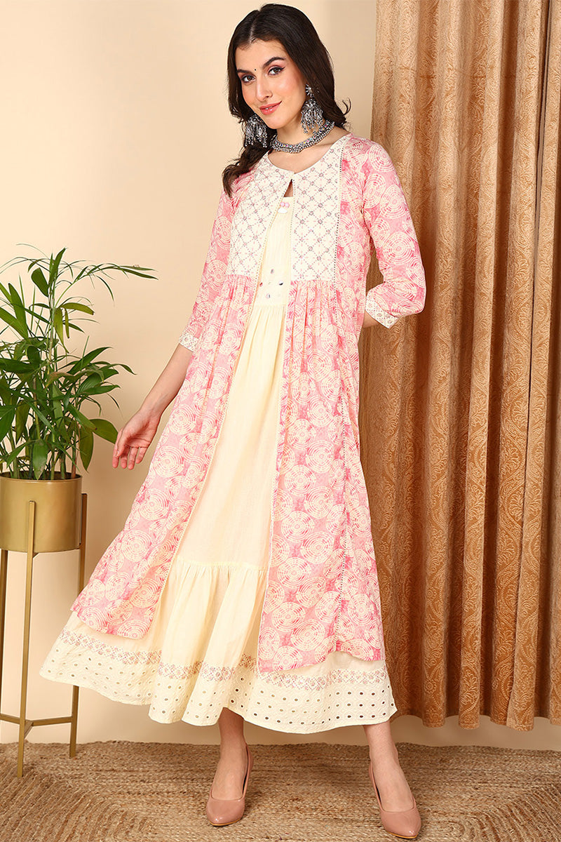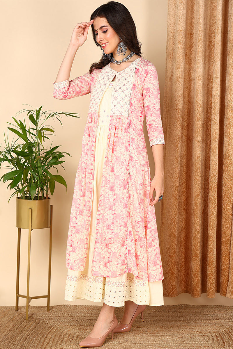 Pink Cotton Geometric Embroidered Flared Kurta