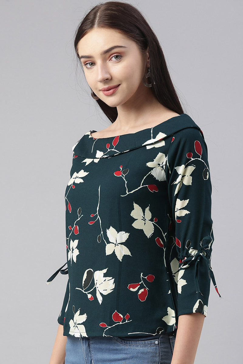Look ultra-stylish in this Poly georgette Teal Floral Printed Top. Crafted from woven georgette, this regular-length top features a bold floral print and a stylish boat neck.